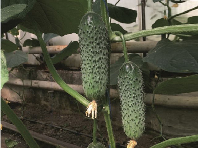 Гибрид отличается превосходной завязываемостью плодов даже в стрессовых условиях (1-2 завязи в узле). Плоды крупные, длиной 14-16 см, массой 120-140 г, цилиндрической формы. Они имеют темно-зеленый цвет и сильно выраженную бугорчатость. Важной особенностью является способность плодов при перерастании удлиняться, сохраняя пропорции и товарный вид. Гибрид лоялен к почвам с повышенной соленостью (высокий EC).