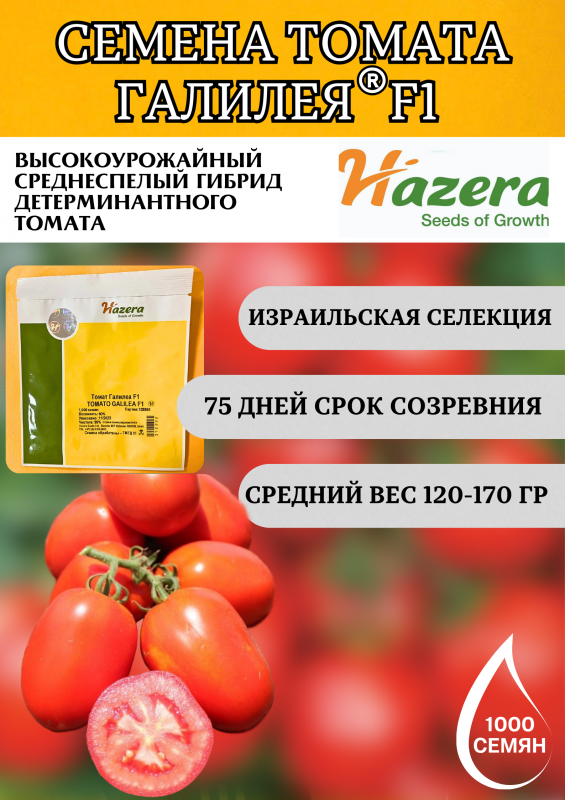 Галилея F1 — высокоурожайный среднеспелый гибрид детерминантного томата от компании Hazera. Формирует крепкое мощное растение с высоким потенциалом урожайности и дружным плодоношением. Плоды ровные, овальной формы, плотные, насыщенно-красного цвета, весом 120–170 г. Отличаются высокой плотностью и прекрасной лежкостью — томаты долго сохраняют товарный вид и вкус.